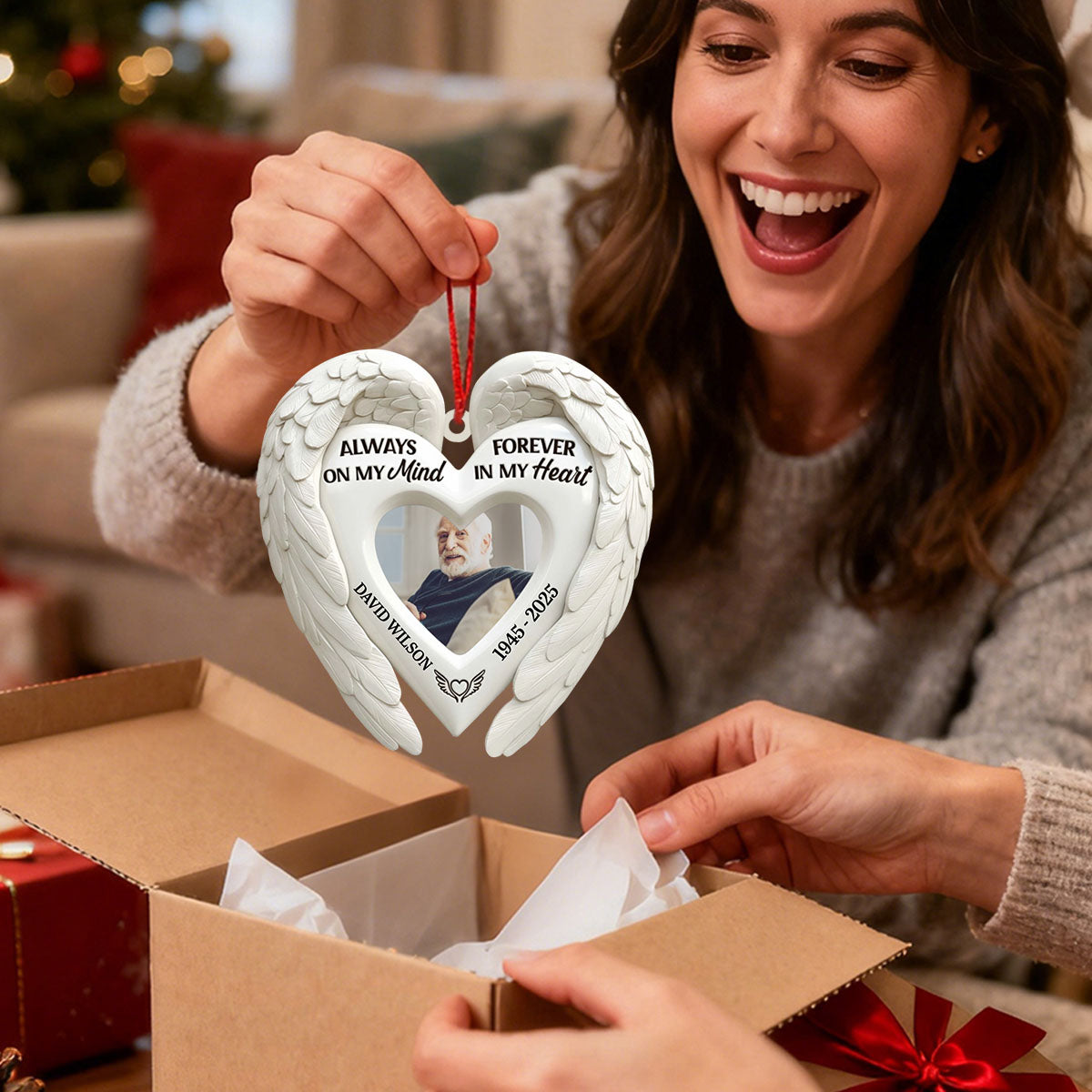Honor your loved one with this touching angel wings ornament, a gentle reminder that they are always remembered and forever cherished. Personalized with a name, this piece offers comfort and a beautiful way to keep memories alive during the holidays and beyond.