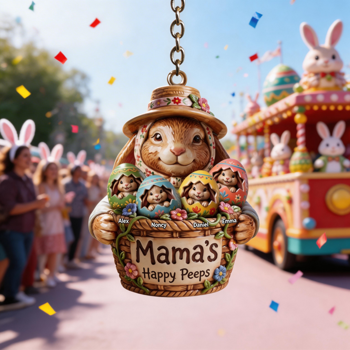 This custom keychain features adorable bunny artwork — one bunny for each grandchild — and is personalized with Grandma’s name and children’s names.