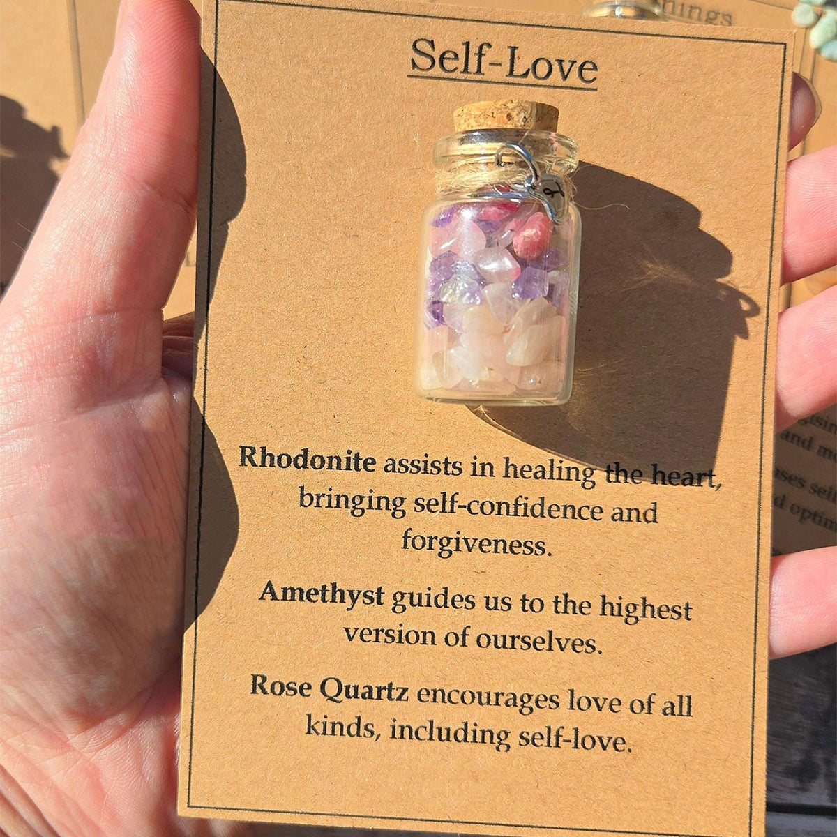 Each bottle contains a mix of crystal chips for the specific area and comes on a backing card with a description of the crystals used. The bottle can be removed safely from the card to keep in a pocket etc.