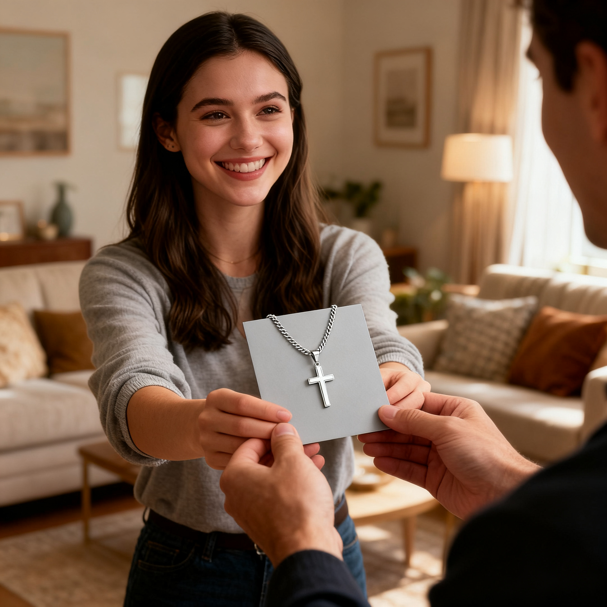 Crafted with care, this delicate cross necklace is more than an accessory; it’s a personal testament to your connection. Made from high-quality stainless steel, it hangs gracefully close to the hear. The true magic lies in the personalization: his name, a special date, or your initials can be engraved on the back, turning a beautiful piece into a one-of-a-kind treasure. 📝💖