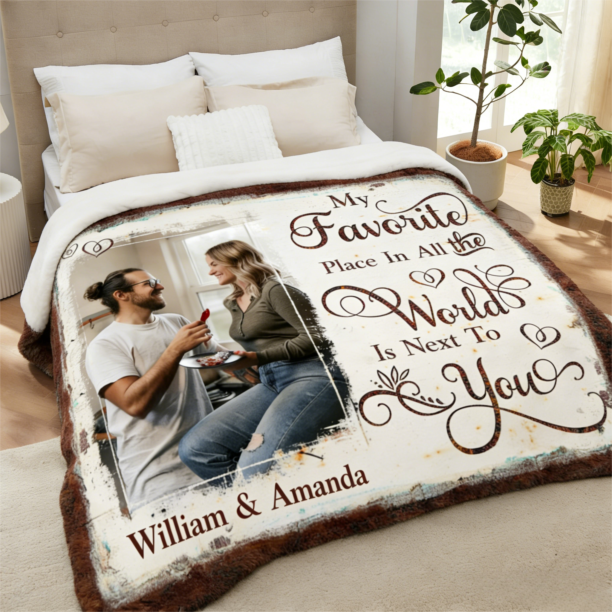 Wrap up in love and warmth with this heartfeltĀ Personalized Couple Blanket, featuring the sweet quote:Ā āMy favorite place in all the world is next to you.āĀ Customize it with your names or a special date to create a snug, sentimental treasure made just for the two of you.