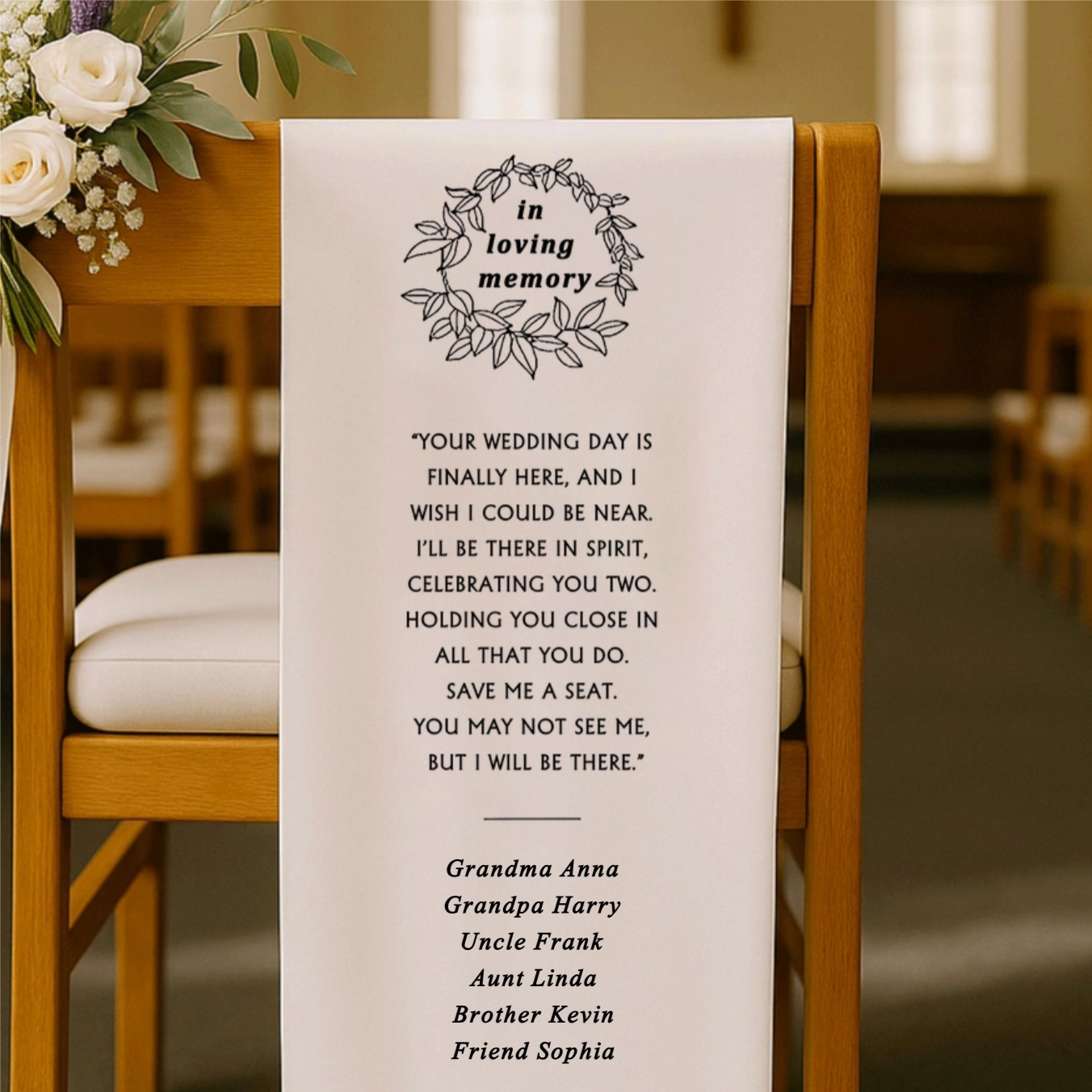 Create a heartfelt space for a loved one who cannot be there in person with this Personalized Family Memorial Wedding Chair Sign. Featuring the tender message “I Will Be There In Loving Memory,” this elegant banner can be customized with their names - offering a gentle reminder that their love surrounds you on your special day.